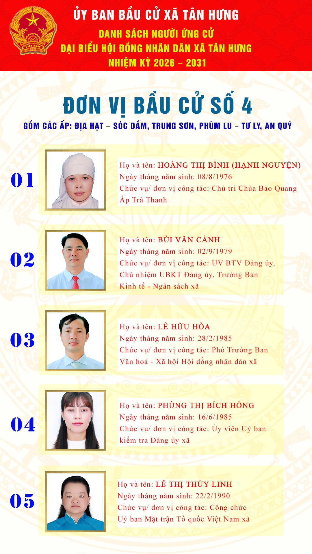 Danh sách người ứng cử đại biểu hội đồng nhân dân xã Tân Hưng nhiệm kỳ 2026-2031 tại đơn vị bầu cử số 4 gồm các ấp Địa Hạt – Sóc Dầm, Trung Sơn, Phùm Lu – Tư Ly, An Quý.