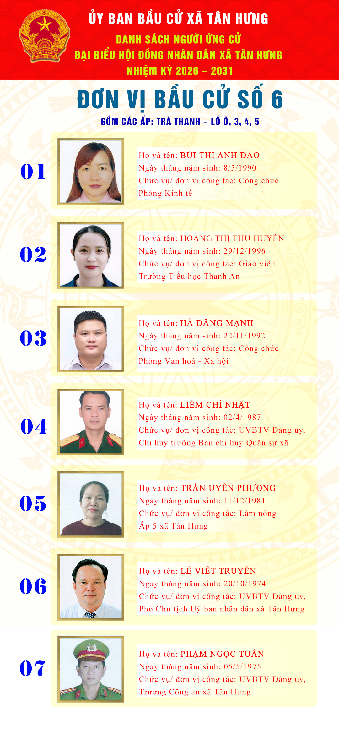Danh sách người ứng cử đại biểu hội đồng nhân dân xã Tân Hưng nhiệm kỳ 2026-2031 tại đơn vị bầu cử số 6 gồm các ấp Trà Thanh – Lồ Ô, 3, 4, 5.