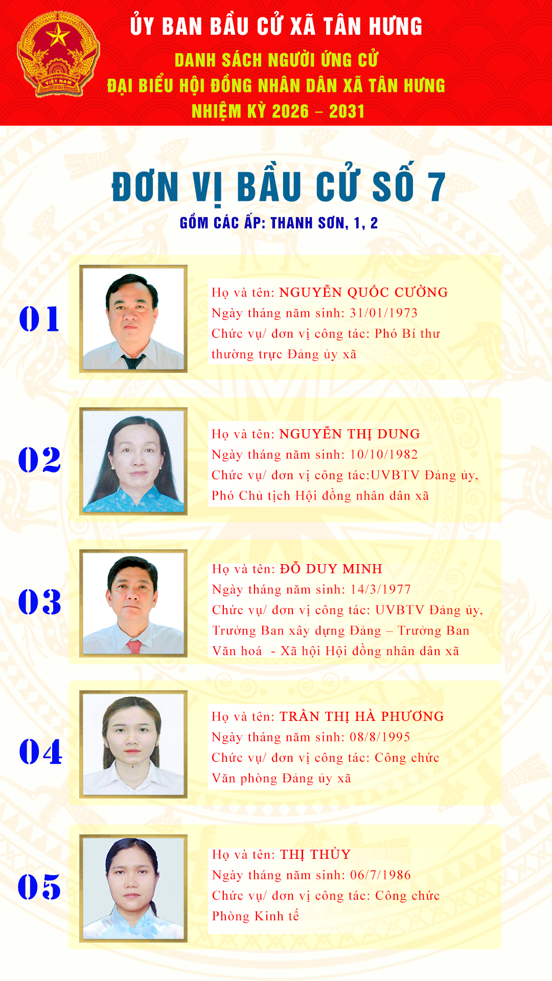 Danh sách người ứng cử đại biểu hội đồng nhân dân xã Tân Hưng nhiệm kỳ 2026-2031 tại đơn vị bầu cử số 7 gồm các ấp Thanh Sơn, 1, 2.