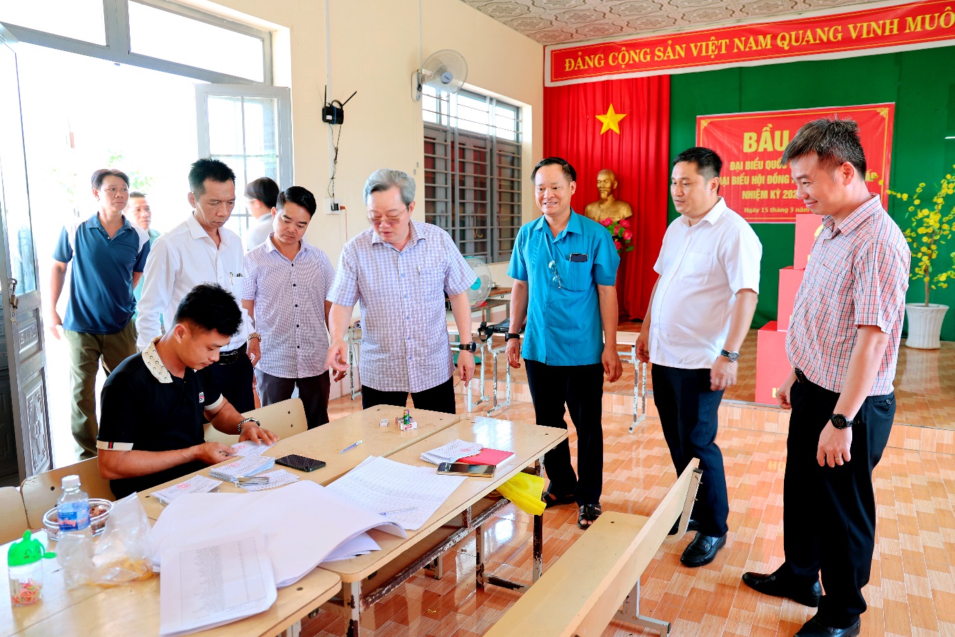 đồng chí Nguyễn Minh Hợi – Ủy viên Ban Thường vụ Tỉnh ủy, Trưởng Ban Nội chính Tỉnh ủy kiểm tra tại điểm bầu cử ấp Hưng Lập B, xã Tân Hưng.