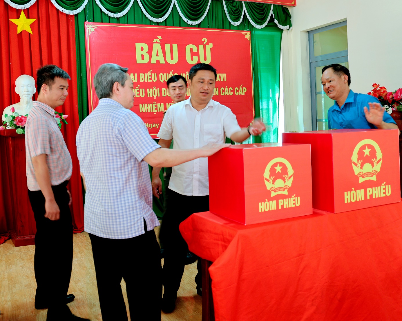 đồng chí Nguyễn Minh Hợi – Ủy viên Ban Thường vụ Tỉnh ủy, Trưởng Ban Nội chính Tỉnh ủy kiểm tra nơi viết phiếu bầu của cử tri tại điểm bầu cử ấp Hưng Lập B, xã Tân Hưng.