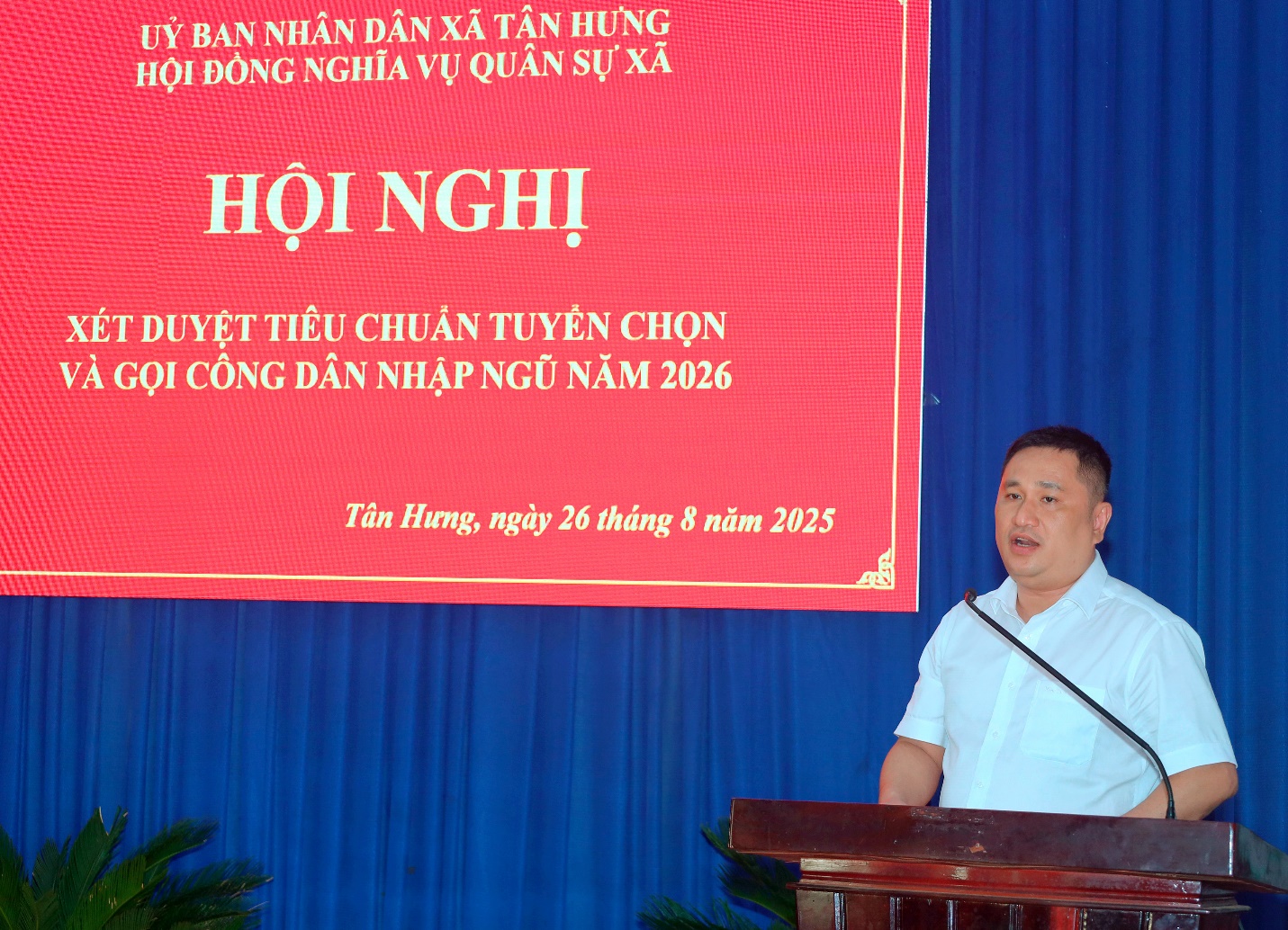 Sáng 26/8, Hội đồng Nghĩa vụ Quân sự (NVQS) xã Tân Hưng tổ chức Hội nghị xét duyệt tiêu chuẩn tuyển chọn và gọi công dân nhập ngũ năm 2026.