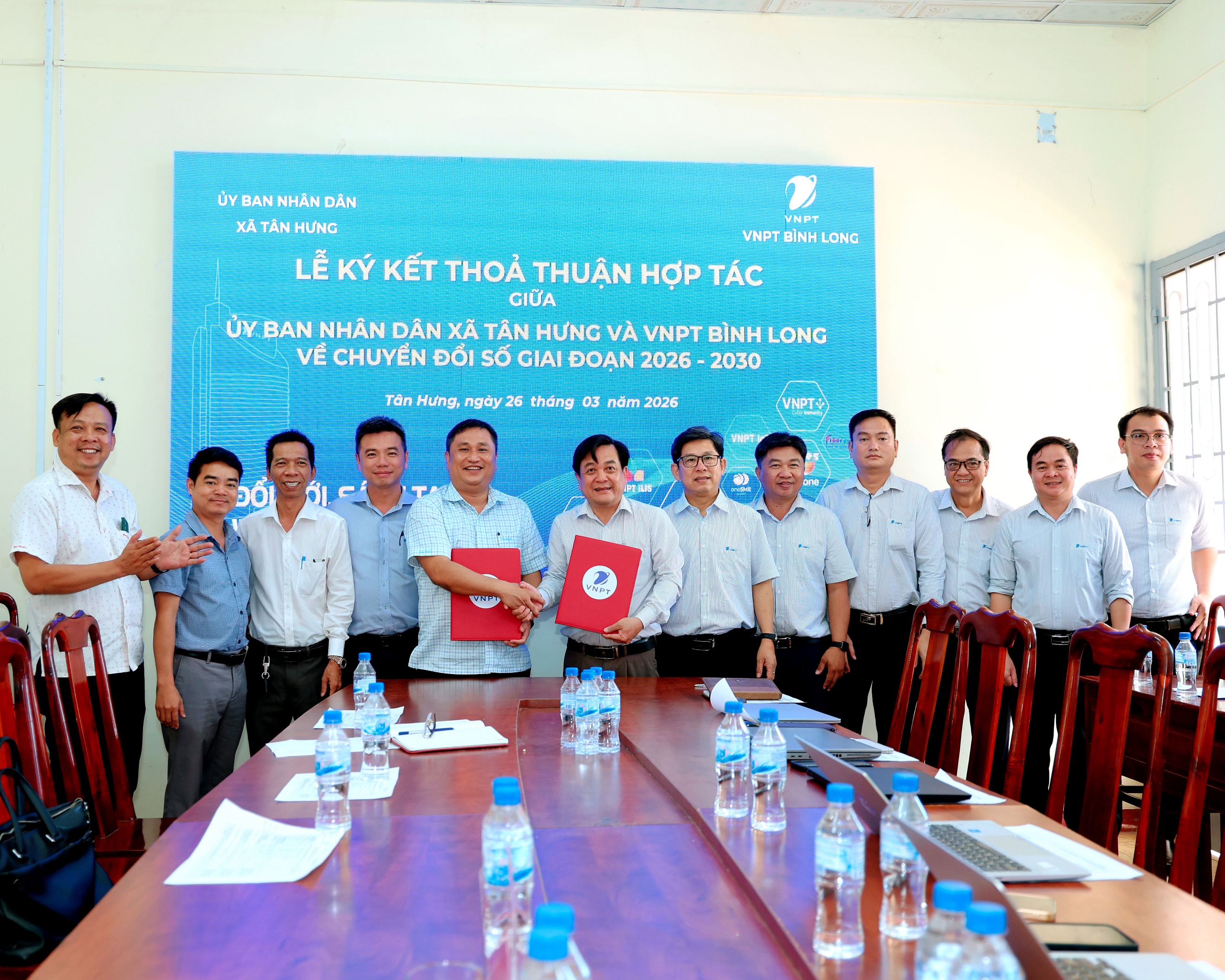 Sáng ngày 26/3, UBND xã Tân Hưng và VNPT Bình Long vừa tổ chức lễ ký kết thỏa thuận hợp tác về chuyển đổi số trong giai đoạn 2026-2030.