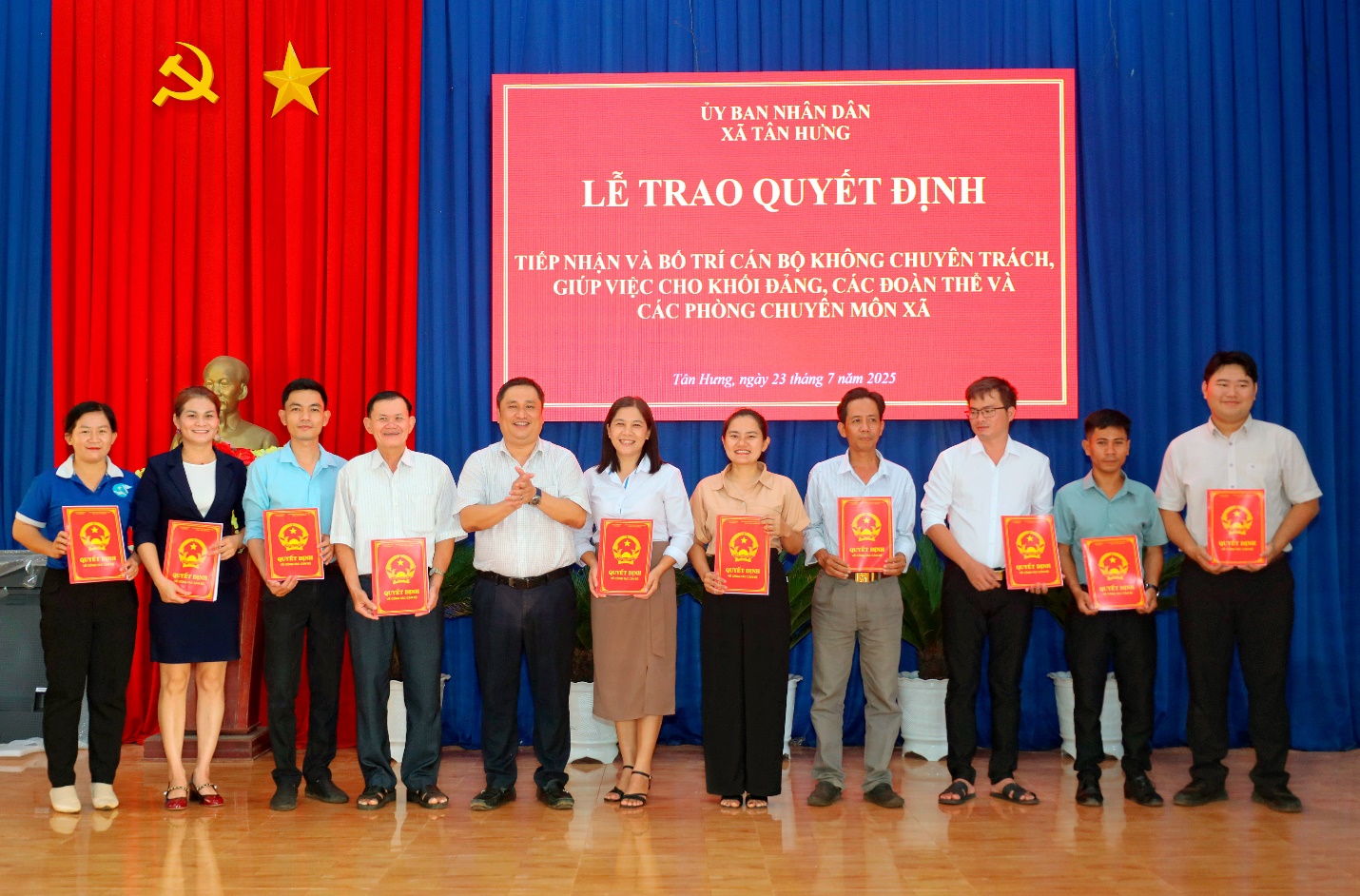 Tại buổi lễ, lãnh đạo Phòng Văn hóa – Xã hội xã Tân Hưng đã thông qua các quyết định về việc tiếp nhận và bố trí công tác cho 22 người hoạt động không chuyên trách cấp xã. Những người hoạt động này sẽ được phân công công tác tại Văn phòng Đảng ủy, Ban Xây dựng Đảng, cơ quan Mặt trận Tổ quốc, Phòng Kinh tế, Phòng Văn hóa, và Trung tâm Dịch vụ Tổng hợp.