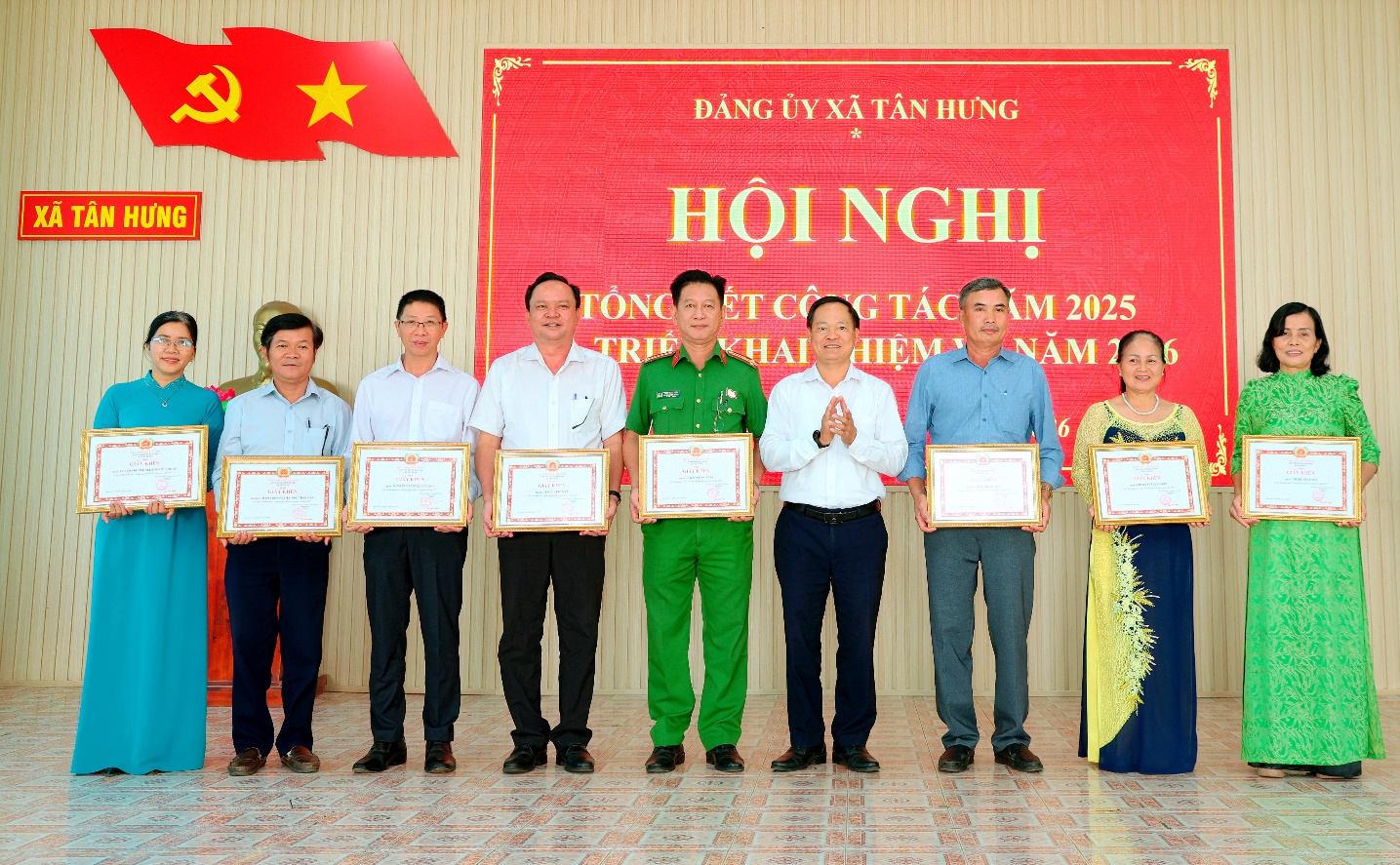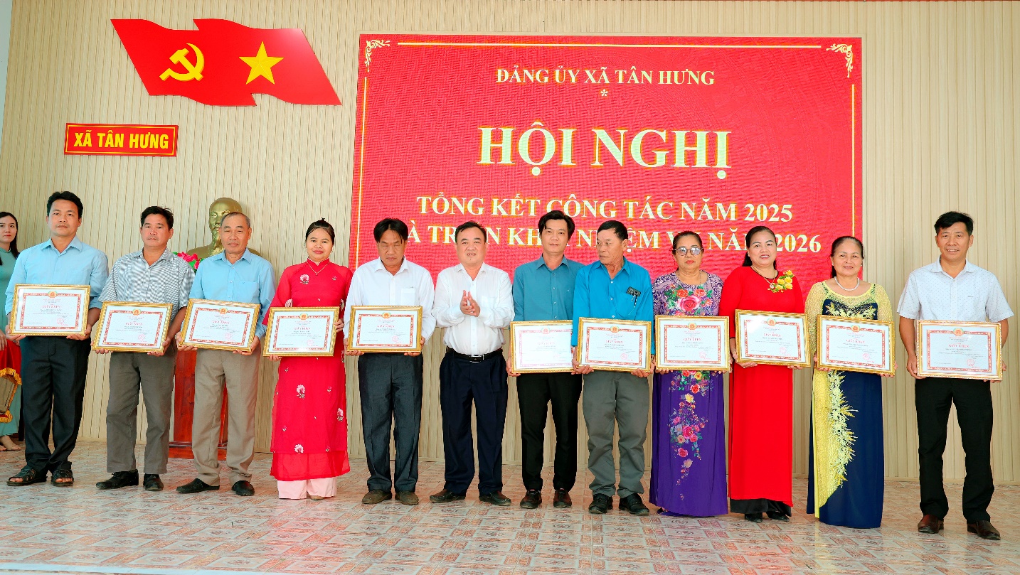 Nhân dịp này, Đảng ủy xã Tân Hưng đã trao tặng giấy khen cho 8 tập thể, 37 cá nhân có thành tích xuất sắc trong công tác xây dựng Đảng và thực hiện nhiệm vụ chính trị năm 2025.