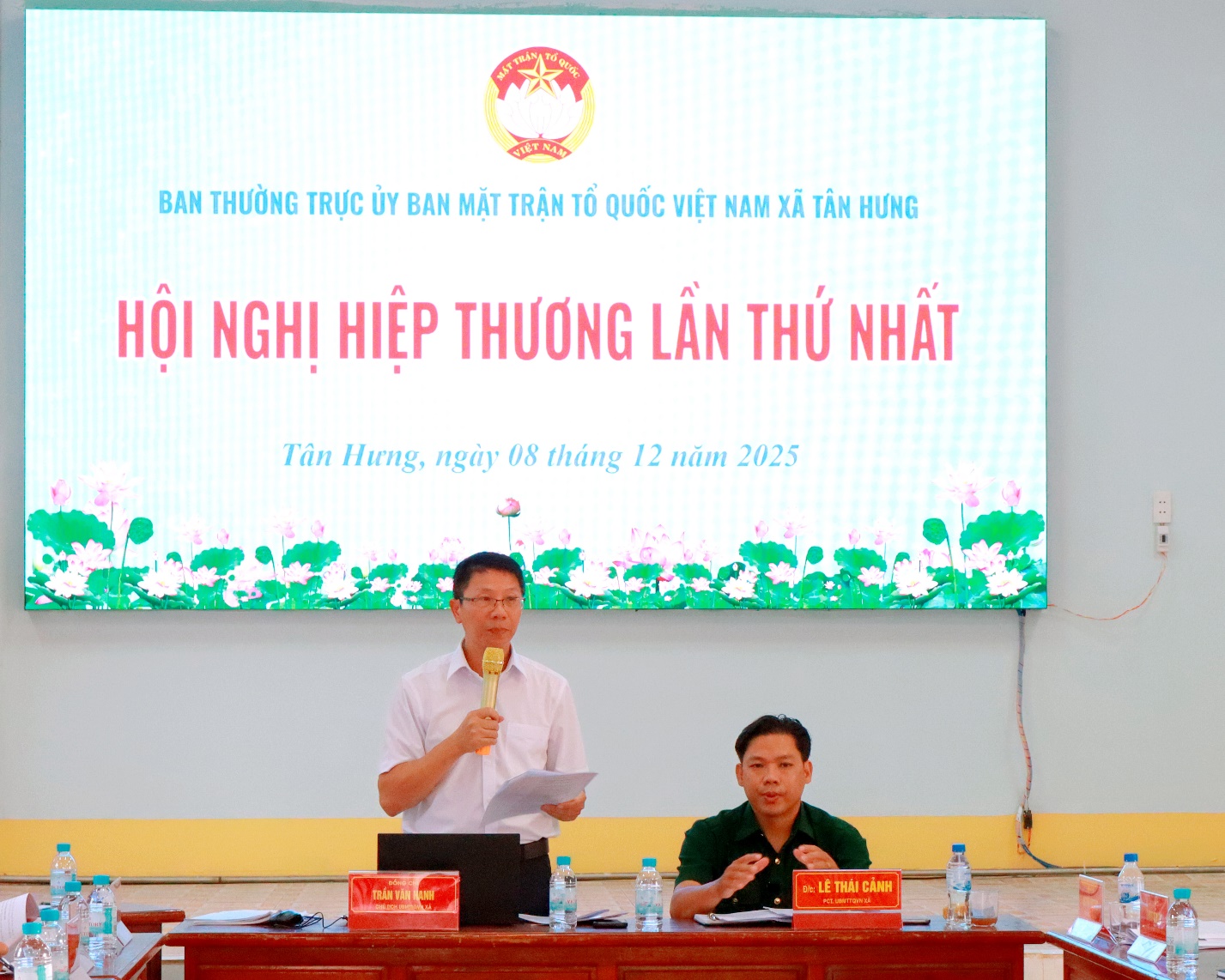 Chiều ngày 08/12/2025, tại Hội trường Đảng ủy, Ủy ban MTTQ Việt Nam xã Tân Hưng tổ chức Hội nghị hiệp thương lần thứ I nhằm thỏa thuận về cơ cấu, thành phần và số lượng người được giới thiệu ứng cử đại biểu HĐND xã khóa VII, nhiệm kỳ 2026–2031.
