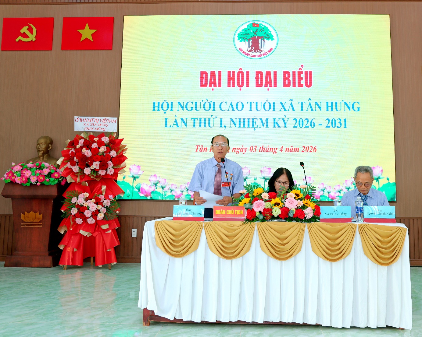 <p style="text-align:justify;">Sáng ngày 3/4, Hội Người cao tuổi (NCT) xã Tân Hưng đã tổ chức thành công Đại hội lần thứ nhất, nhiệm kỳ 2026-2031.&nbsp;</p><p style="text-align:justify;">Đồng chí Nguyễn Quốc Cường - Phó Bí thư Thường trực Đảng ủy; đồng chí Trần Văn Hanh - Chủ tịch Ủy ban MTTQ Việt Nam xã, cùng các đồng chí đại diện các cơ quan, đơn vị của xã và 58 đại biểu đại diện cho các hội viên trong toàn xã.&nbsp;</p><p style="text-align:justify;">Theo báo cáo, toàn xã hiện có 2.850 hội viên Người cao tuổi sinh hoạt tại 25 chi hội.. Trong nhiệm kỳ 2021–2026, Hội đã phối hợp tổ chức mừng thọ cho 60 cụ với kinh phí trên 90 triệu đồng; vận động 950 suất quà trị giá 285 triệu đồng vào các dịp lễ, Tết và đã kịp thời thăm hỏi hội viên lúc ốm đau, hiếu hỷ.&nbsp;</p><p style="text-align:justify;">Đặc biệt, trong 5 năm Hội đã xóa 12 căn nhà tạm cho hội viên với tổng số tiền 960 triệu đồng. Đến nay 100% hội viên đã được cấp thẻ Bảo hiểm y tế. Hội cũng chủ động phối hợp với các cơ sở y tế tổ chức tư vấn sức khỏe, khám bệnh và cấp thuốc miễn phí cho 66 hội viên với tổng kinh phí 64 triệu đồng.&nbsp;</p><p style="text-align:justify;">Hội có 15 câu lạc bộ văn hóa, thể thao, các CLB đã duy trì nếp sinh hoạt định kỳ, trở thành sân chơi bổ ích giúp hội viên sống vui, sống khỏe và hỗ trợ lẫn nhau trong cuộc sống thường ngày.&nbsp;</p><p style="text-align:justify;">Phát huy tinh thần dân chủ, trách nhiệm, Đại hội đã bầu 27 đại biểu tham gia Ban Chấp hành Hội Người cao tuổi xã Tân Hưng nhiệm kỳ 2026–2031. Ông Nguyễn Thanh Nghị được bầu giữ chức Chủ tịch Hội Người cao tuổi xã.&nbsp;</p><p style="text-align:justify;">Phát biểu tại Đại hội, đồng chí Nguyễn Quốc Cường - Phó bí thư thường trực Đảng Uỷ xã ghi nhận, biểu dương những kết quả mà Hội NCT xã đã đạt được trong thời gian qua; đồng thời đề nghị trong nhiệm kỳ mới, Hội tiếp tục làm tốt công tác chăm sóc, phát huy vai trò người cao tuổi, góp phần xây dựng xã ngày càng phát triển, văn minh, giàu đẹp.&nbsp;&nbsp;</p><p style="text-align:justify;">Dịp này, Hội Người cao tuổi xã đã trao tặng giấy khen cho 3 tập thể và 13 cá nhân tiêu biểu đã có nhiều đóng góp cho công tác Hội nhiệm kỳ qua.</p><p>Một số hình ảnh tại Đại hội</p><p style="text-align:center;"><img src="https://tanhung.dongnai.gov.vn/uploads/tanhung/news/2026_04/image_11.jpeg" width="604" height="402" /><img src="https://tanhung.dongnai.gov.vn/uploads/tanhung/news/2026_04/image_13.jpeg" width="604" height="402" /><img src="https://tanhung.dongnai.gov.vn/uploads/tanhung/news/2026_04/image_10.jpeg" width="604" height="483" /><img src="https://tanhung.dongnai.gov.vn/uploads/tanhung/news/2026_04/image_12.jpeg" width="604" height="483" /><img src="https://tanhung.dongnai.gov.vn/uploads/tanhung/news/2026_04/image_9.jpeg" width="604" height="483" /><img src="https://tanhung.dongnai.gov.vn/uploads/tanhung/news/2026_04/image_14.jpeg" width="604" height="402" /><img src="https://tanhung.dongnai.gov.vn/uploads/tanhung/news/2026_04/image_8.jpeg" width="604" height="483" /></p><p>&nbsp;</p>
