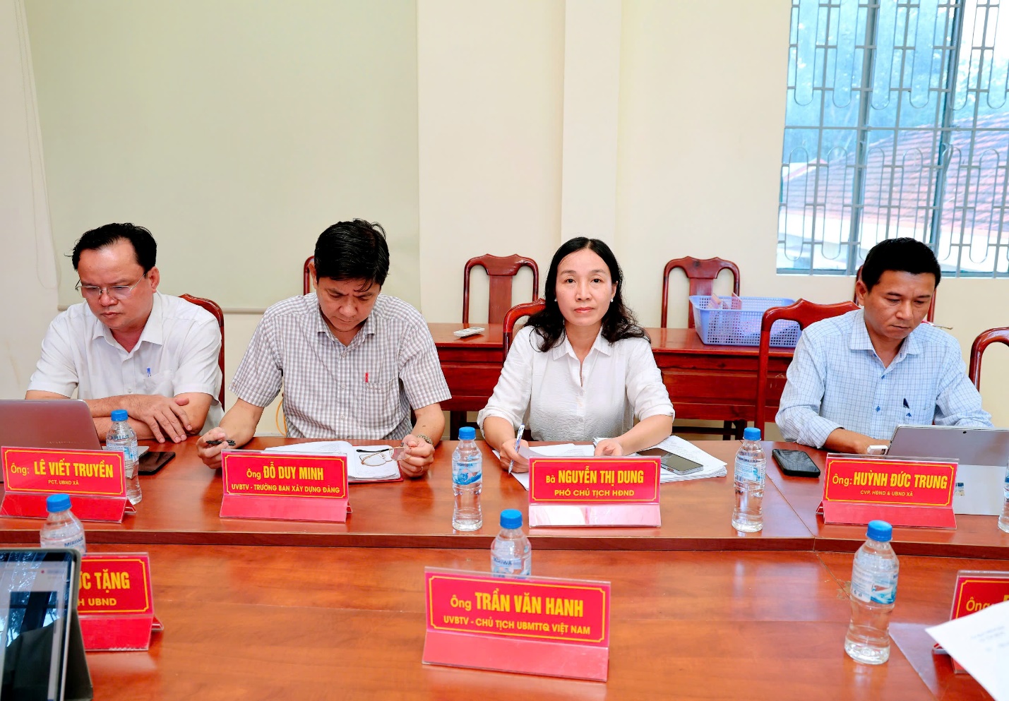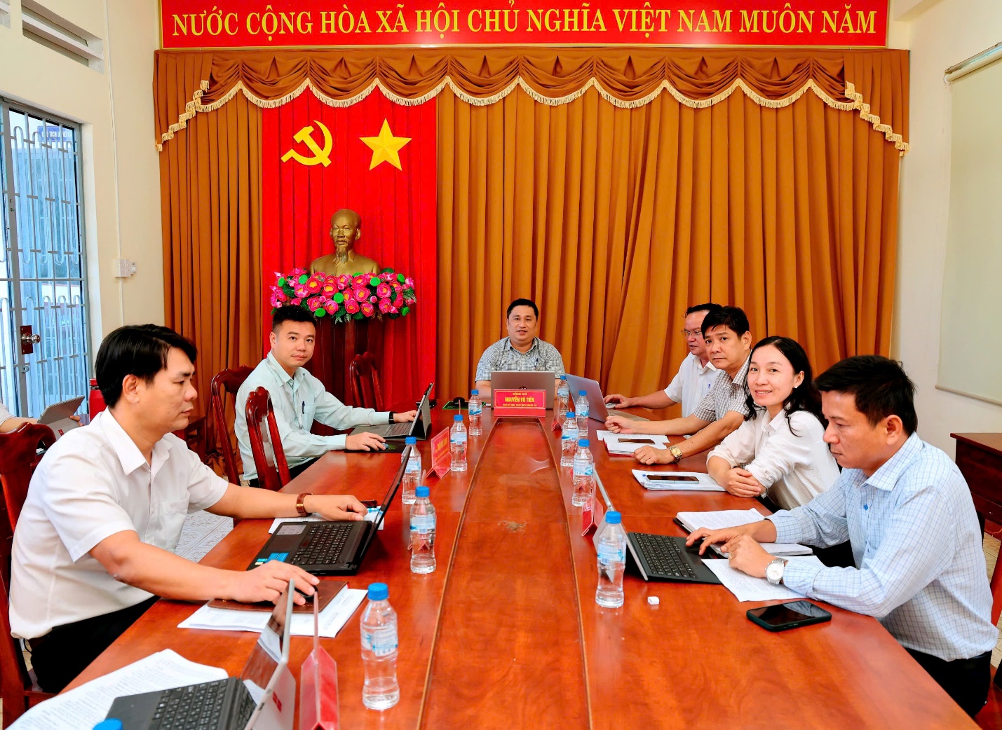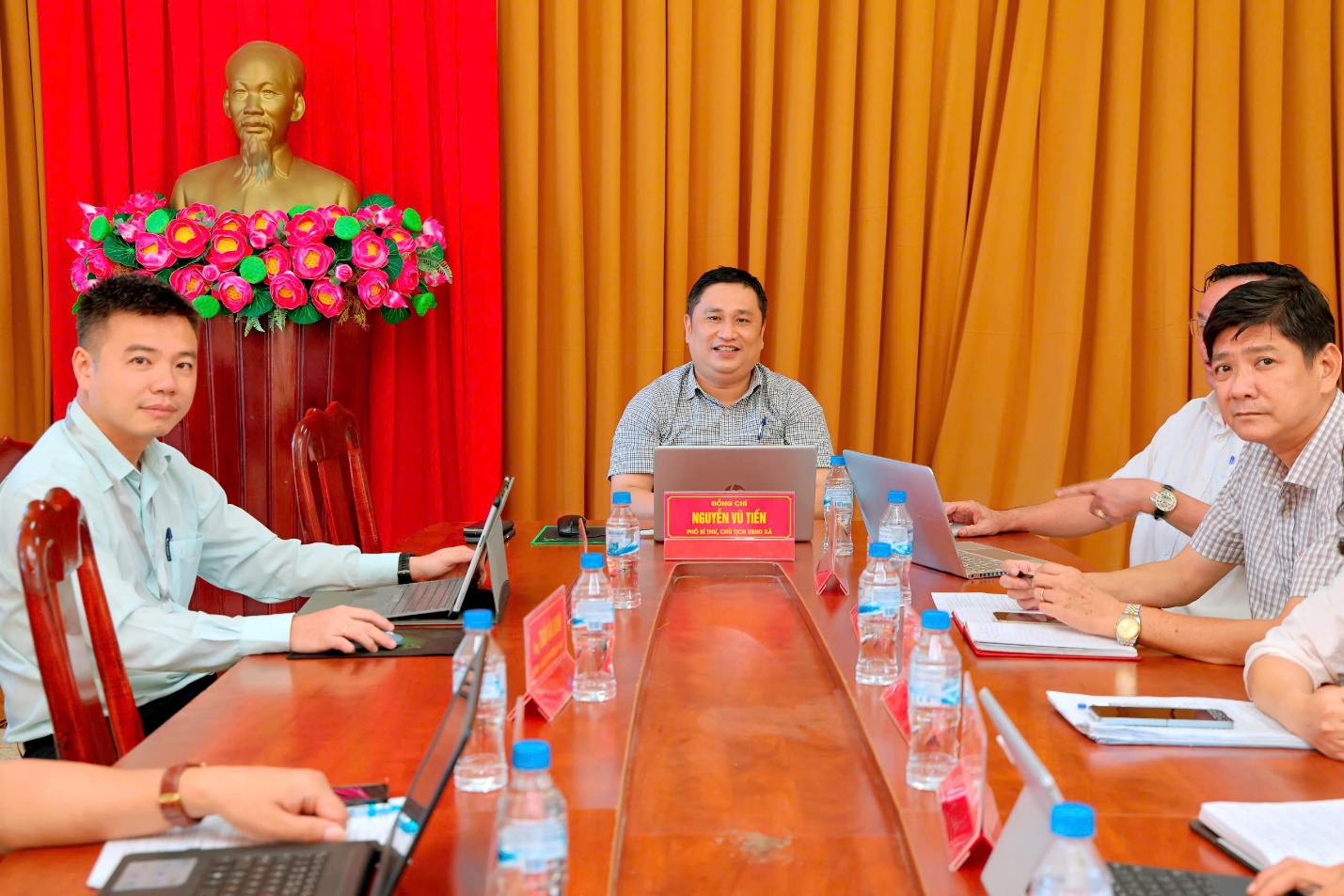 Đồng chí Nguyễn Vũ Tiến – Phó Bí thư, Chủ tịch UBND xã chủ trì cuộc họp. Tham dự có đồng chí Nguyễn Thị Dung – Phó Chủ tịch HĐND xã, đồng chí Đỗ Duy Minh – Trưởng Ban Xây dựng Đảng, đồng chí Bùi Văn Cảnh – Chủ nhiệm Ủy ban Kiểm tra Đảng ủy, các Phó Chủ tịch UBND xã cùng lãnh đạo các phòng chuyên môn.