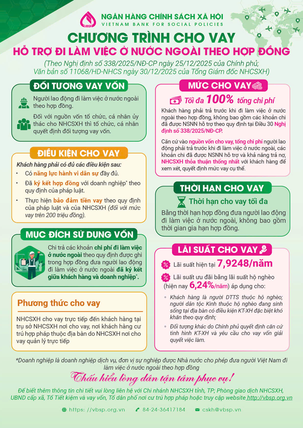Ngày 25/12/2025 Thủ tướng Chính phủ đã ban hành Nghị định số 338/2025/NĐ-CP, quy định chi tiết một số điều của Luật Việc làm về chính sách hỗ trợ tạo việc làm, duy trì và mở rộng việc làm; theo đó, ngày 30/12/2025 Ngân hàng Chính sách xã hội (NHCSXH) có Hướng dẫn số 11068/HD-NHCS về nghiệp vụ cho vay đối với Người lao động đi làm việc ở nước ngoài theo hợp đồng và Hướng dẫn số 11055/HD-NHCS về nghiệp vụ cho vay hỗ trợ tạo việc làm, duy trì, mở rộng việc làm Chính sách hỗ trợ tạo việc làm theo Nghị định 338/2025/NĐ-CP được triển khai trên cơ sở Luật số 74/2025/QH15, bao gồm cho vay tạo việc làm, duy trì và mở rộng việc làm; cho vay hỗ trợ người lao động đi làm việc ở nước ngoài theo hợp đồng; chính sách việc làm công; hỗ trợ đào tạo nghề cho người lao động khu vực nông thôn và thanh niên; cùng các chính sách hỗ trợ khác liên quan đến thị trường lao động. Đối tượng áp dụng gồm người lao động; cơ sở sản xuất, kinh doanh có nhu cầu vay vốn hỗ trợ tạo việc làm; cùng các cơ quan, tổ chức liên quan.