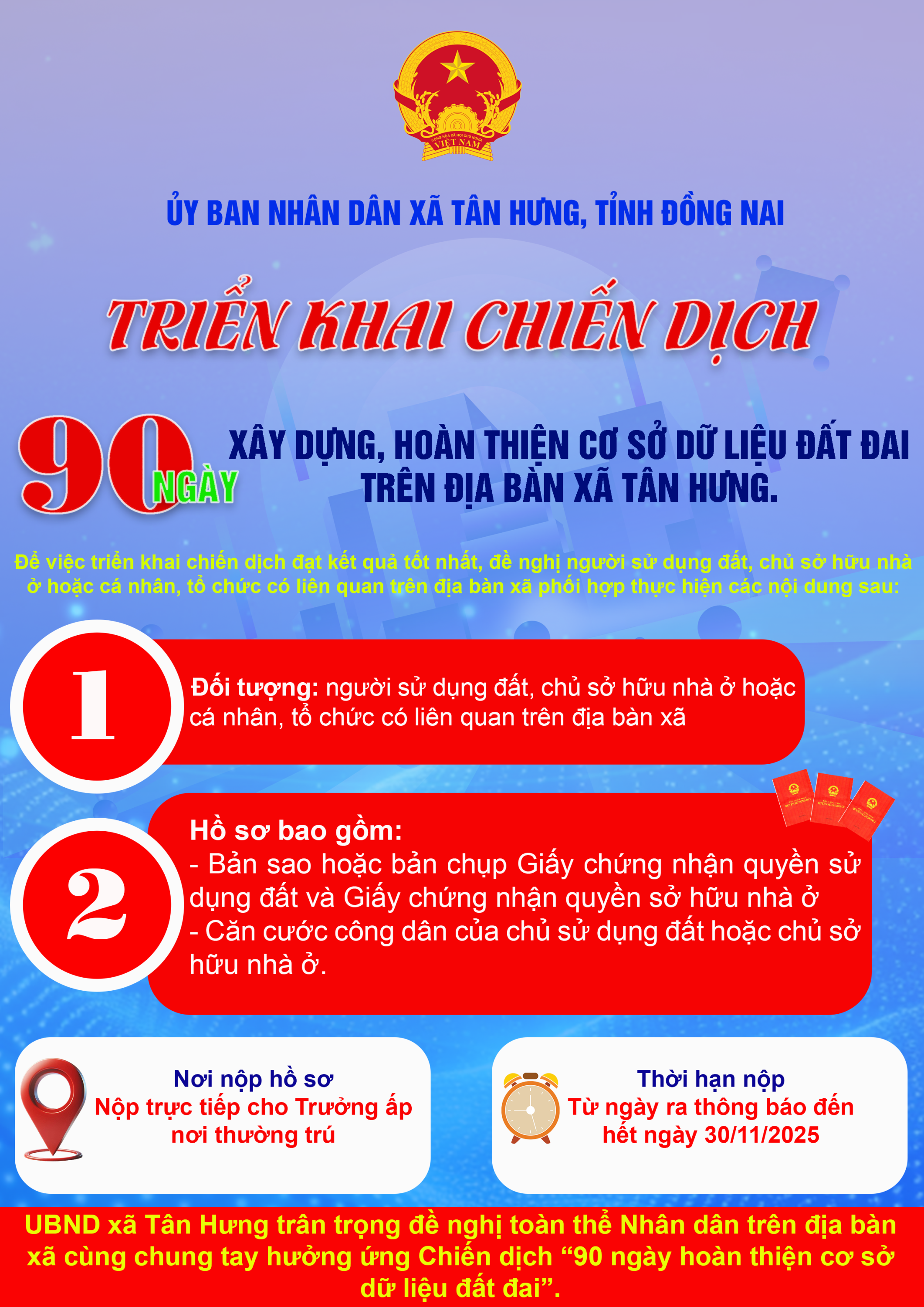 UBND xã Tân Hưng trân trọng đề nghị toàn thể Nhân dân cùng đồng hành, hợp tác để Chiến dịch 90 ngày hoàn thiện cơ sở dữ liệu đất đai đạt kết quả tốt nhất, góp phần xây dựng chính quyền điện tử và phục vụ người dân ngày càng hiệu quả hơn.