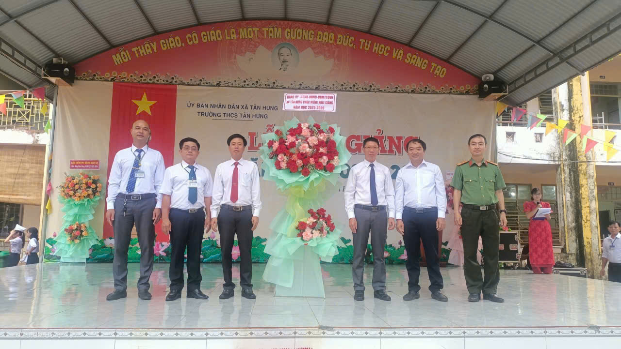 Ông Trần Văn Hanh, UVBTV – Chủ tịch UBMTTQ Việt Nam xã Tân Hưng tham gia Lễ Khai giảng và tặng hoa chúc mừng thầy và trò Trường THCS Tân Hưng