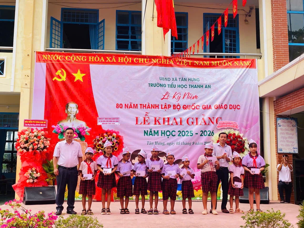 Ông Nguyễn Vũ Tiến, Phó Bí thư – Chủ tịch UBND xã tham dự khai giảng và tặng quà cho học sinh Trường Tiểu học Thanh An, xã Tân Hưng