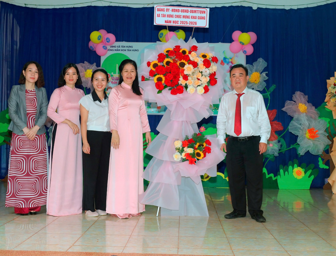 Ông Nguyễn Quốc Cường, Phó Bí thư thường trực Đảng ủy xã tham dự Lễ khai giảng và tặng hoa chúc mừng cô và trò Trường Mầm non Tân Hưng, xã Tân Hưng.