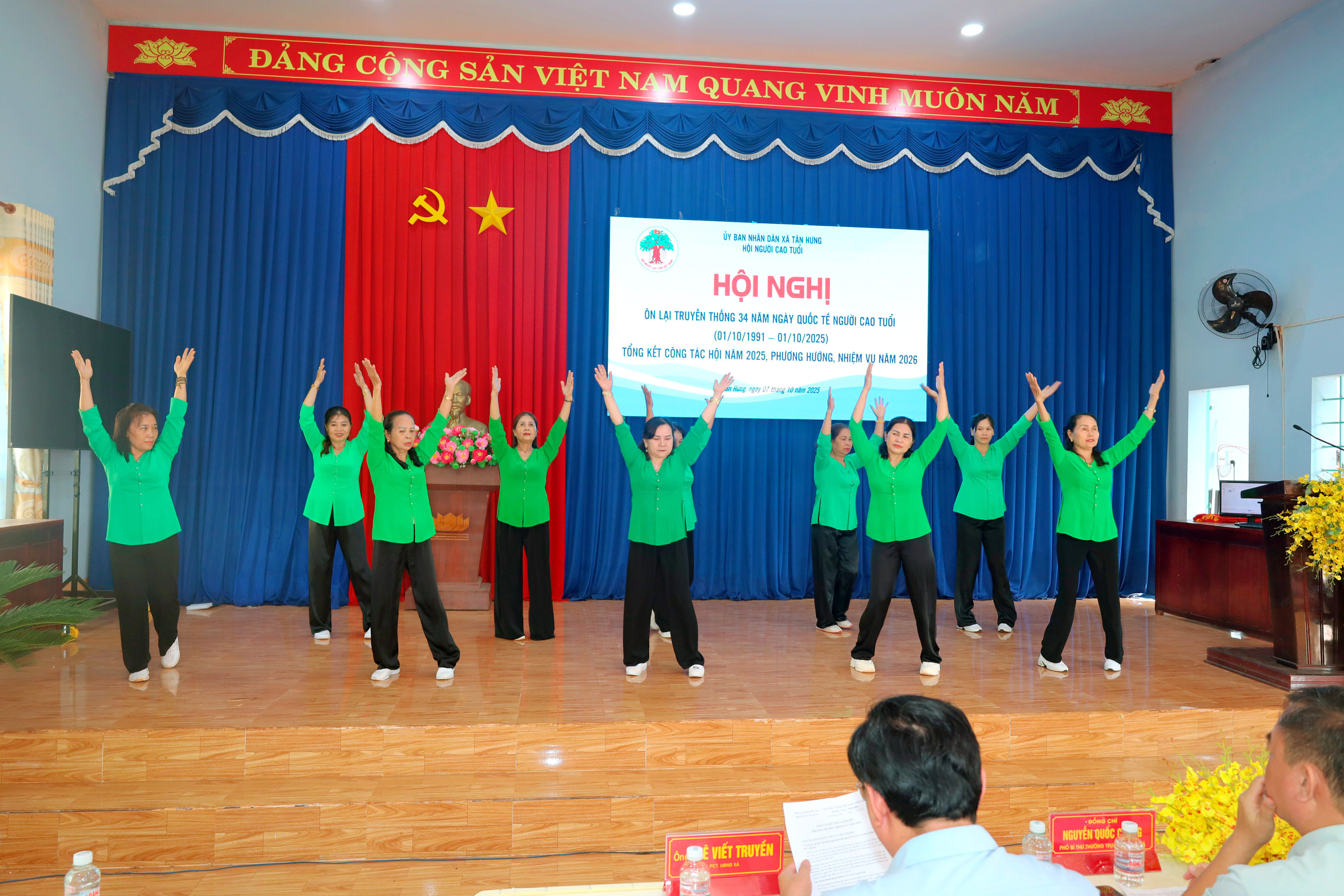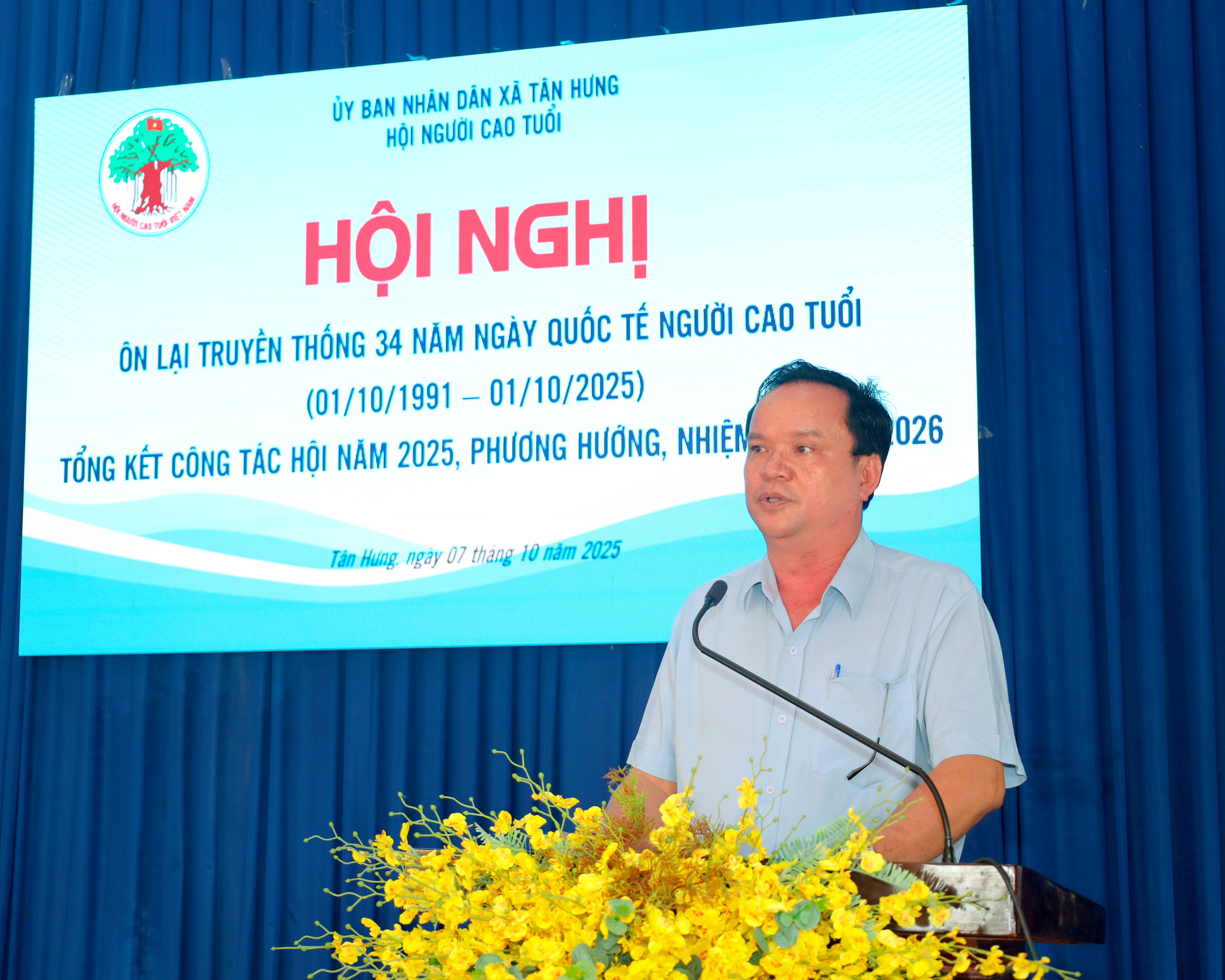 Sáng 7/10, Hội Người cao tuổi (NCT) xã Tân Hưng đã tổ chức Hội nghị ôn lại truyền thống 34 năm Ngày Quốc tế Người cao tuổi (1/10) và tổng kết công tác Hội năm 2025; đồng thời đề ra phương hướng, nhiệm vụ năm 2026.