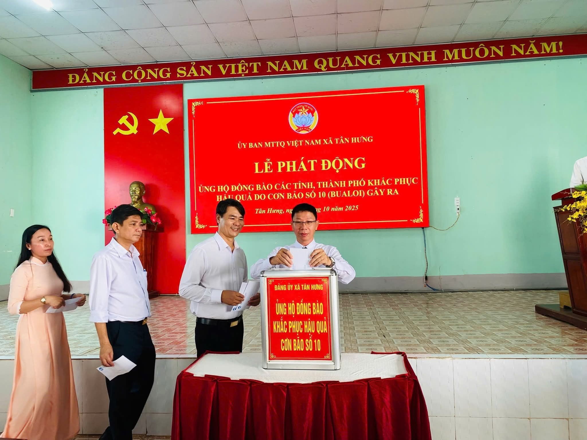 Trước đó, hưởng ứng lời kêu gọi của Đoàn Chủ tịch Ủy ban Trung ương MTTQ Việt Nam về vận động ủng hộ đồng bào khắc phục hậu quả thiên tai, ngày 6/10/2025, Ban Thường trực Ủy ban MTTQ Việt Nam xã Tân Hưng đã ban hành văn bản vận động các ban, ngành, đoàn thể, cơ quan, đơn vị, cán bộ, công chức, viên chức, người lao động cùng các doanh nghiệp, tổ chức kinh tế và các nhà hảo tâm trong, ngoài tỉnh chung tay hỗ trợ Nhân dân vùng bị thiệt hại.