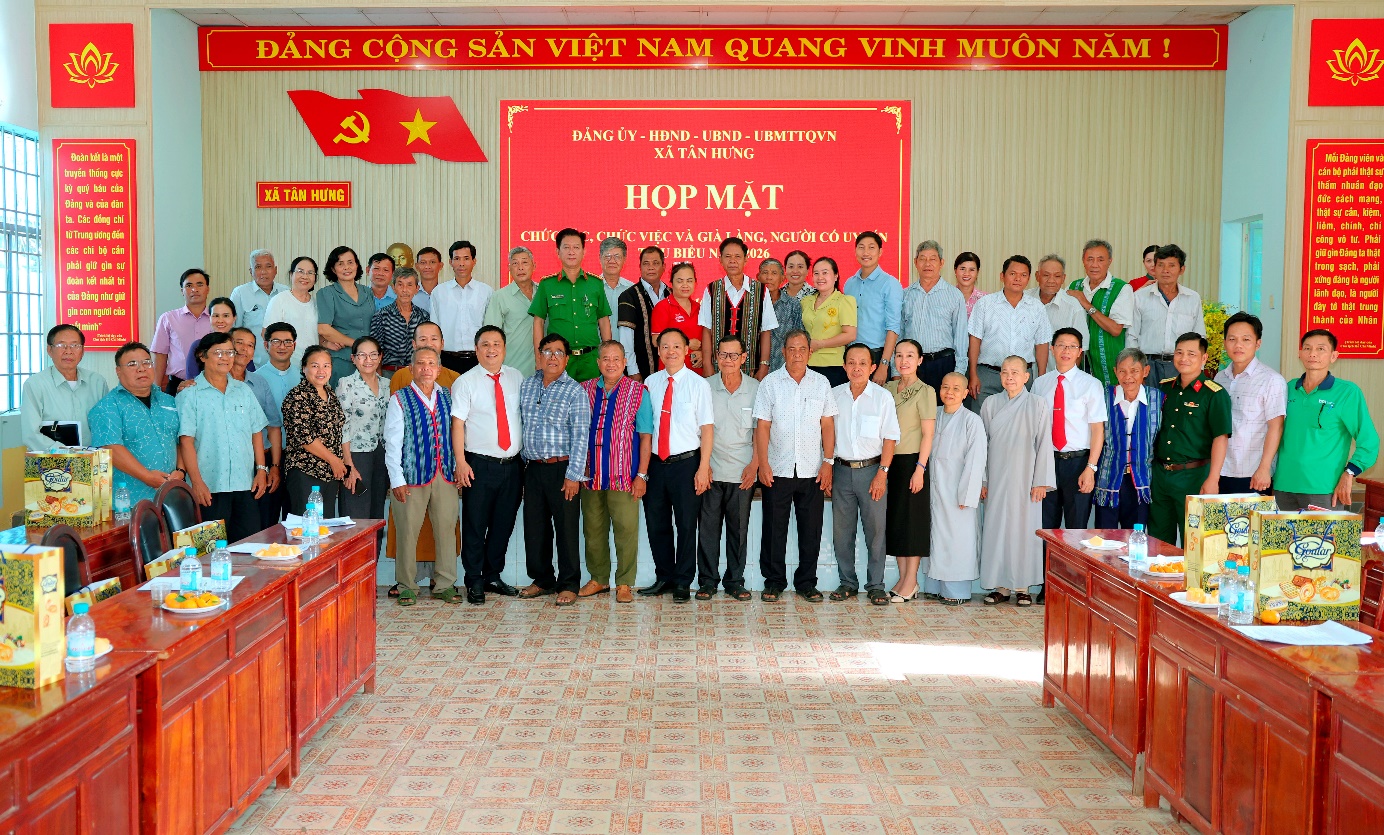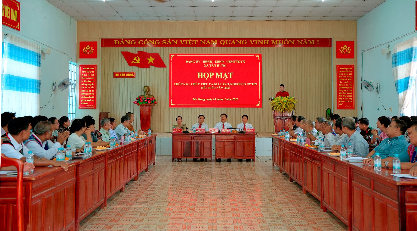 Chiều ngày 10/3/2026, Đảng ủy - HĐND - UBND - Ủy ban MTTQ Việt Nam xã Tân Hưng đã tổ chức buổi Họp mặt chức sắc, chức việc, già làng và người có uy tín tiêu biểu trên địa bàn xã năm 2026.