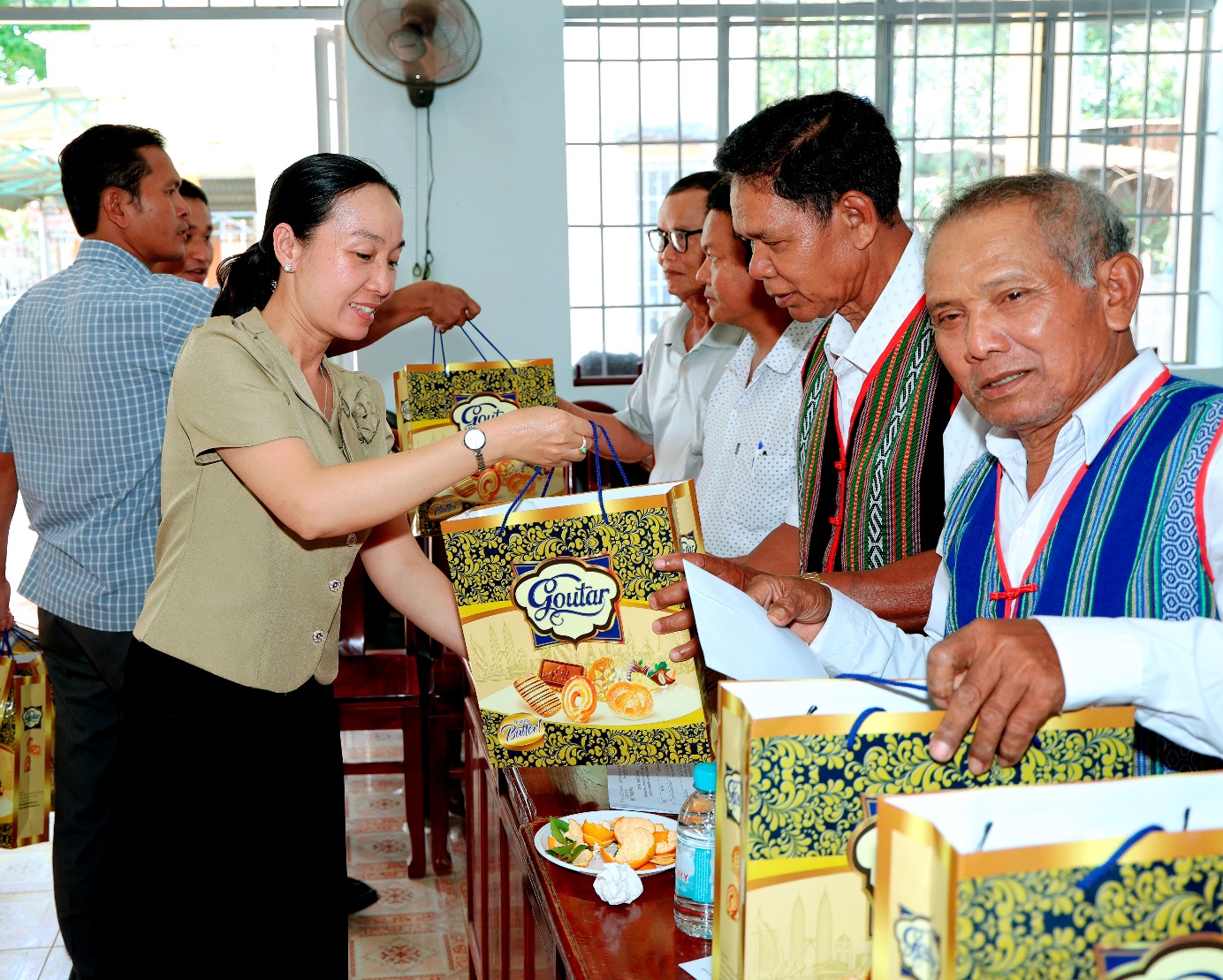 Bà Nguyễn Thị Dung - Ủy viên Ban Thường vụ Đảng ủy, Phó Chủ tịch HĐND xã Tân Hưng trao tặng những phần quà của Đảng ủy - HĐND - UBND - Ủy ban MTTQ Việt Nam xã Tân Hưng cho các già làng, người có uy tín trên địa bàn