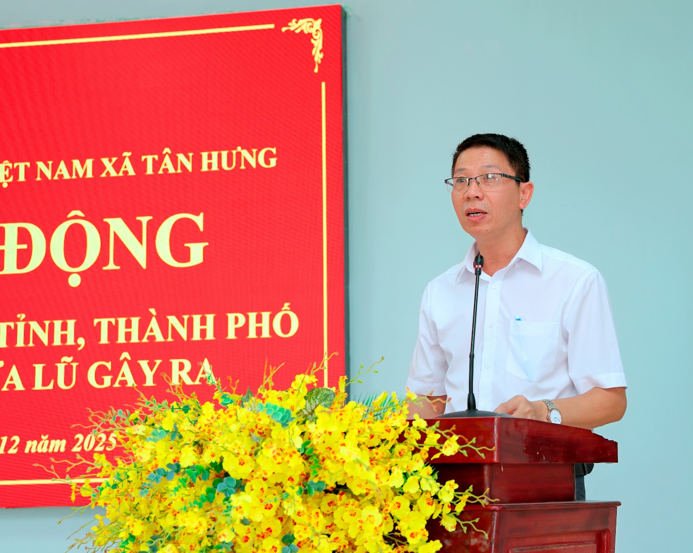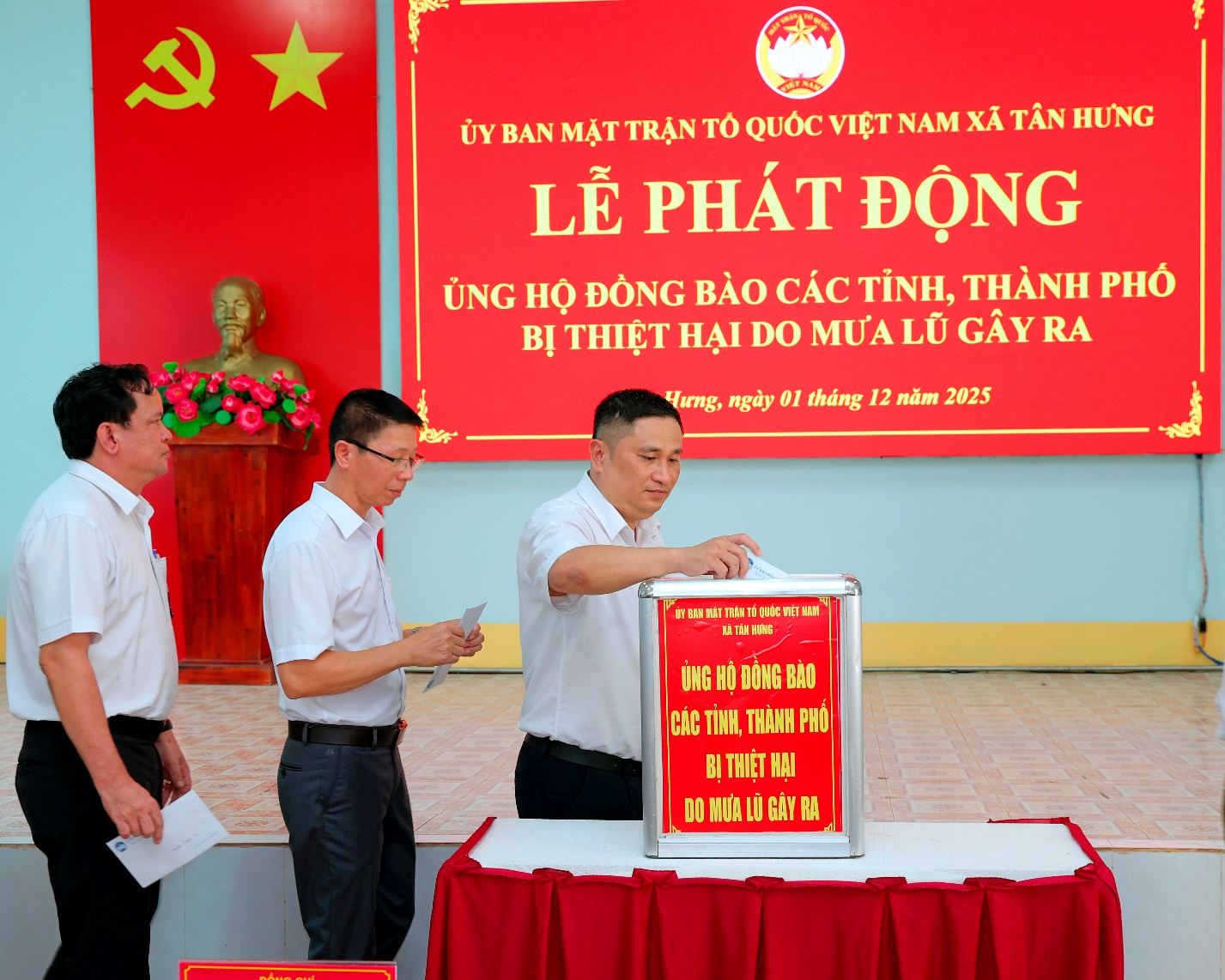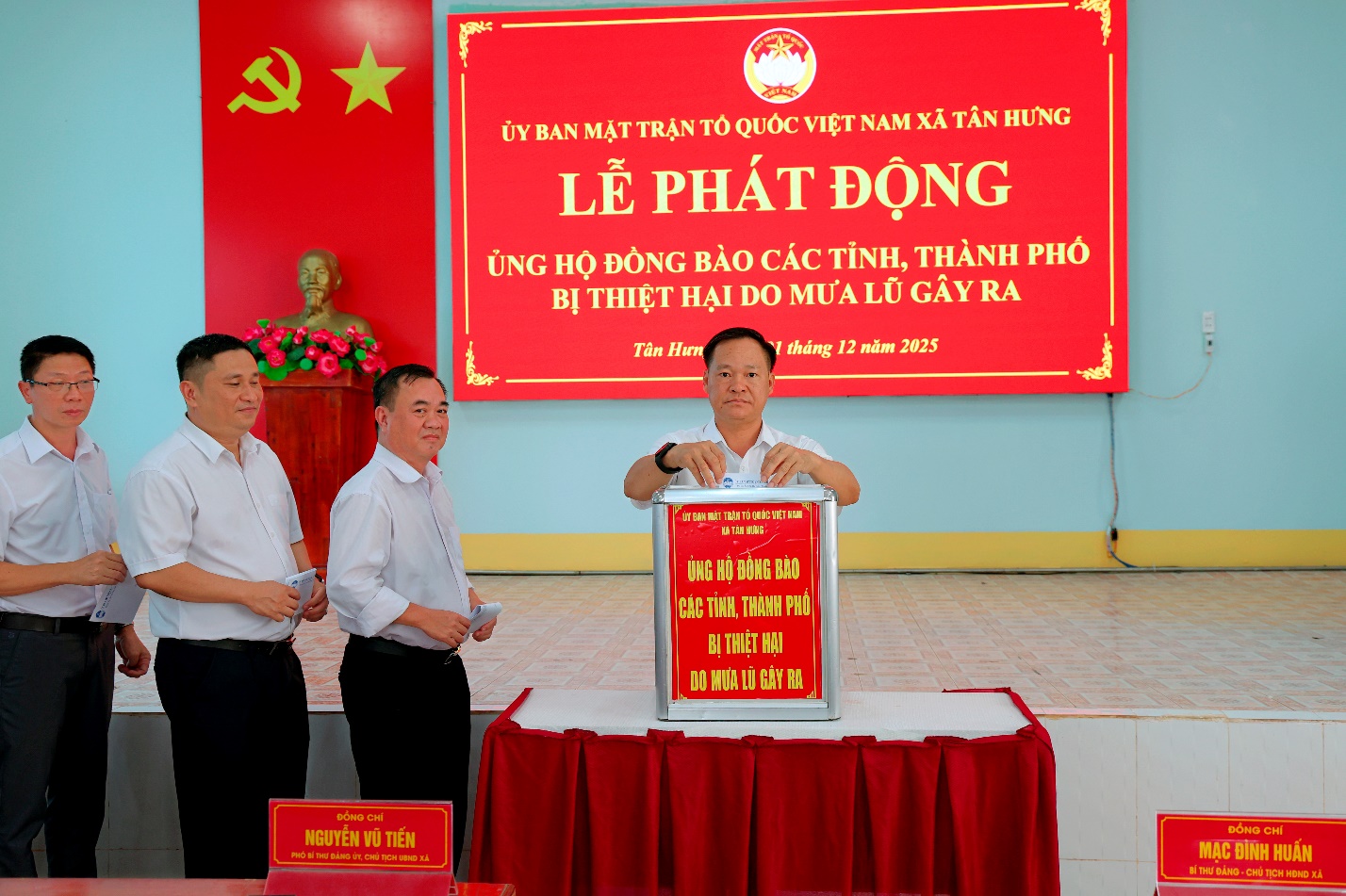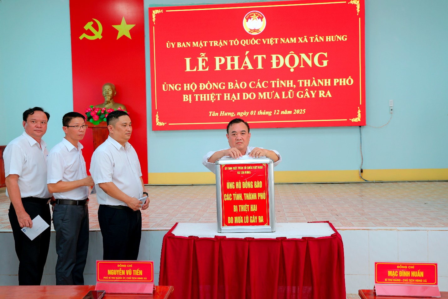 Hưởng ứng Lời kêu gọi của Đoàn Chủ tịch Ủy ban Trung ương MTTQ Việt Nam về vận động ủng hộ đồng bào khắc phục hậu quả mưa lũ do bão số 11 và số 12, chiều ngày 01/12/2025, Đảng ủy – HĐND – UBND – UBMTTQ Việt Nam xã Tân Hưng đã tổ chức Lễ phát động ủng hộ đồng bào các tỉnh, thành phố bị thiệt hại do mưa lũ gây ra trong toàn thể các cơ quan, đơn vị, lực lượng vũ trang, doanh nghiệp, tổ chức tôn giáo, các nhà hảo tâm, cán bộ, công chức, viên chức, người lao động, học sinh và Nhân dân trên địa bàn.
