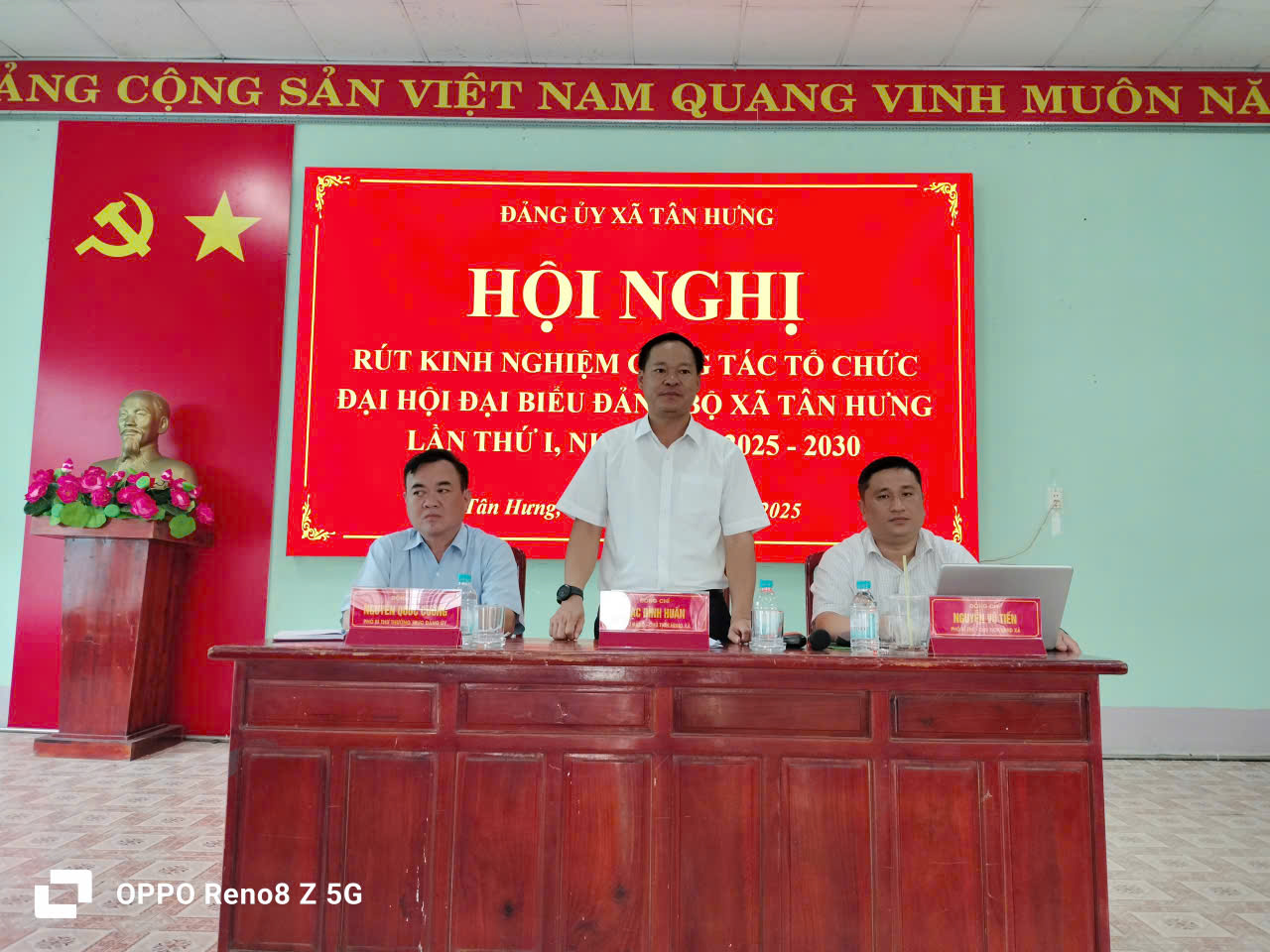 Chỉ sau một tháng thành lập, bên cạnh việc kiện toàn tổ chức bộ máy và ổn định hoạt động sau sáp nhập, Đảng bộ xã Tân Hưng đã tổ chức thành công Đại hội đại biểu Đảng bộ xã Tân Hưng trong 2 ngày 8–9/8. Công tác chuẩn bị nội dung, điều kiện tổ chức được triển khai nghiêm túc, đúng tiến độ, bảo đảm chất lượng theo tinh thần Chỉ thị 45-CT/TW của Bộ Chính trị và các chỉ đạo của cấp trên.