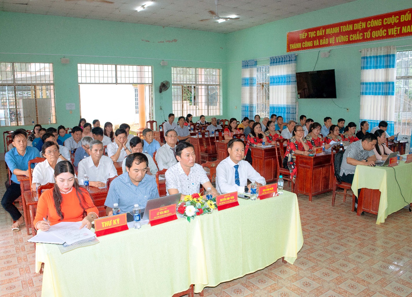 đồng chí Mạc Đình Huấn, Bí thư Đảng ủy – Chủ tịch HĐND xã, đồng chí Nguyễn Vũ Tiến, Phó Bí thư – Chủ tịch UBND xã, các đồng chí trong Ban Chấp hành Đảng ủy xã tặng hoa chúc mừng UBMTTQ Việt Nam xã.