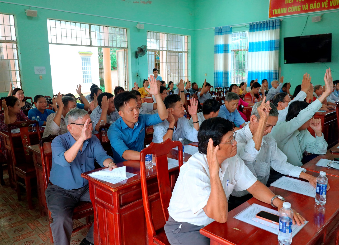Các ủy viên Ủy ban MTTQ Việt Nam xã biểu quyết thông qua Nghị quyết tại Hội nghị